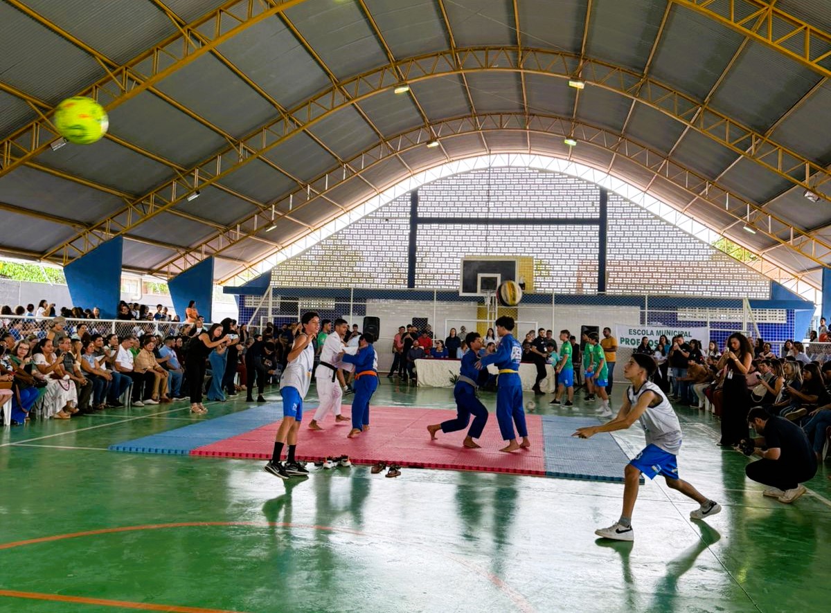 A cerimônia reuniu autoridades na mesa de abertura e contou com apresentações esportivas dos estudantes. (Foto: Assessoria)